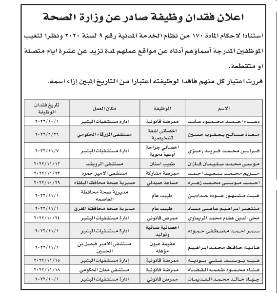 أعلنت وزارة الصحة، واستنادا لأحكام المادة 170 من نظام الخدمة المدنية، أن التالي أسماؤهم فاقدين لوظائفهم اعتباراً من التاريخ المبين إزاء اسم كل منهم.