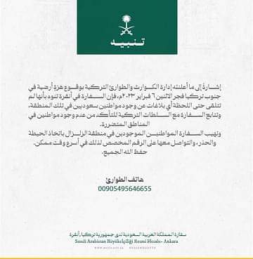 وقالت السفارة السعودية بتركيا، في بيان نشرته على حسابها في تويتر: "إشارة إلى ما أعلنته إدارة الكوارث والطوارئ التركية بوقوع هزة أرضية في جنوب تركيا فجر الاثنين 6 فبراير 2023، فإن السفارة في أنقرة تنوه بأنها لم تتلق أي بلاغات عن وجود مواطنين سعوديين في تلك المنطقة".