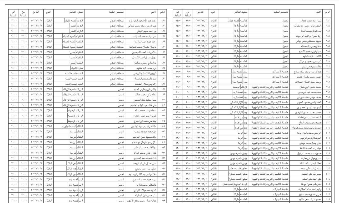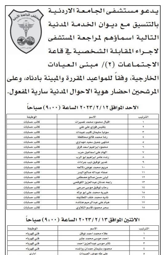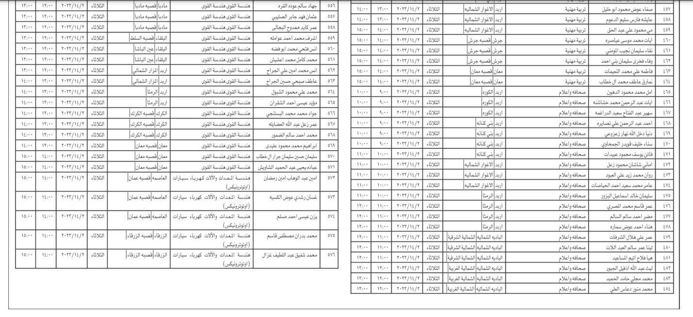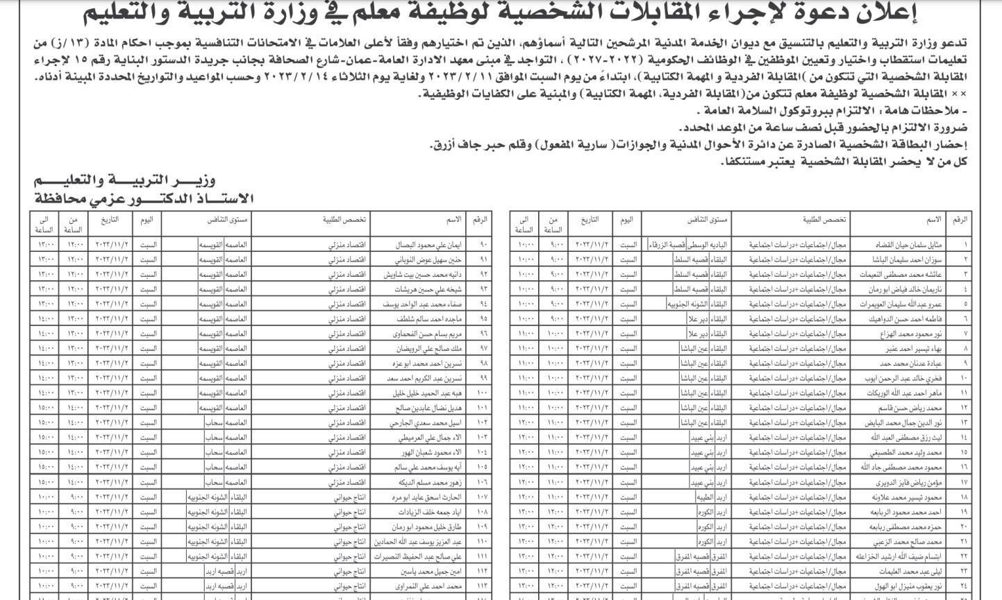 دعت وزارة التربية والتعليم وعدد من المؤسسات الرسمية وبالتنسيق مع ديوان الخدمة المدنية اليوم الثلاثاء، عدد من المرشحين لإجراء المقابلات الشخصية.