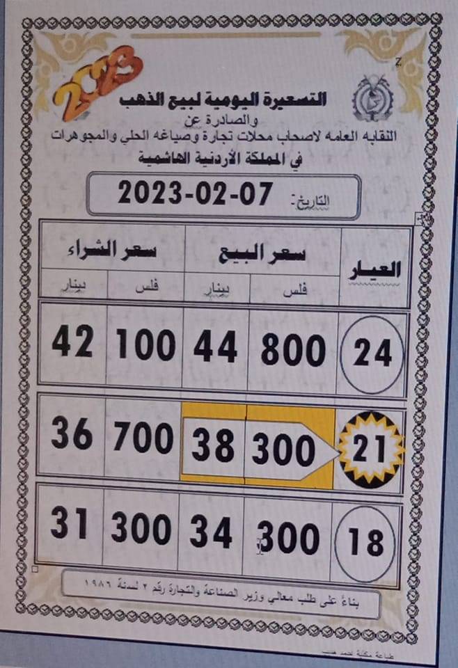 وبلغ سعر بيع غرام الذهب عيار 21 الأكثر رغبة من الأردنيين بالسوق المحلية عند 38,30 دينارا لغايات شراء المواطنين من محلات الصاغة.