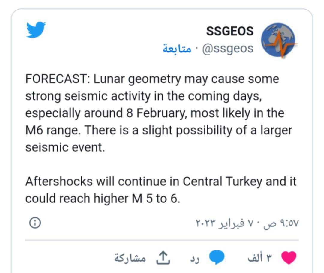 وقال معهد الأبحاث لرصد الهندسة بين الأجرام السماوية ذات الصلة بالنشاط الزلزالي في تغريدة بتويتر: "التنبؤ: قد تتسبب الهندسة القمرية في بعض النشاط الزلزالي القوي في الأيام المقبلة، خاصة حوالي 8 فبراير ، على الأرجح في نطاق M6 (6 درجات على مقياس رختر). هناك احتمال ضئيل لحدث زلزالي أكبر".