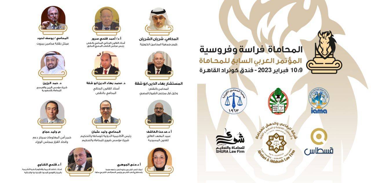 تنطلق يوم الخميس الموافق ٩ فبراير الجاري فاعليات المؤتمر العربي السابع للمحاماة تحت شعار المحاماة فراسة وفروسية بفندق كونراد القاهرة، والذي تنظمه الأكاديمية الدولية للوساطة والتحكيم (IAMA)، بمشاركة جمعية المحامين الكويتية ممثلة في المحامي شريان الشريان رئيس الجمعية، ونقابة محامين بيروت لبنان ممثلة المحامي يوسف لحود، وشورى للمحاماة والتحكيم القاهرة، والرفاعي والدهش للمحاماة بالسعودية، وقسطاس للمعرفة القانونية بالأردن.