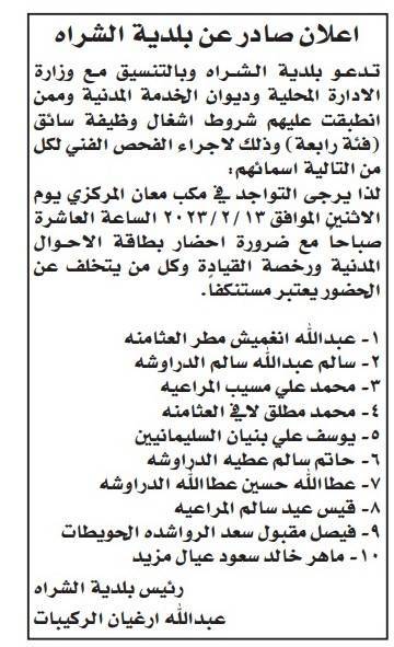 دعت عدة مؤسسات حكومية، اليوم الخميس، بالتنسيق مع ديوان الخدمة المدنية، عدداً من المرشحين للتعيين لمراجعتها لاستكمال إجراءات تعيينهم.