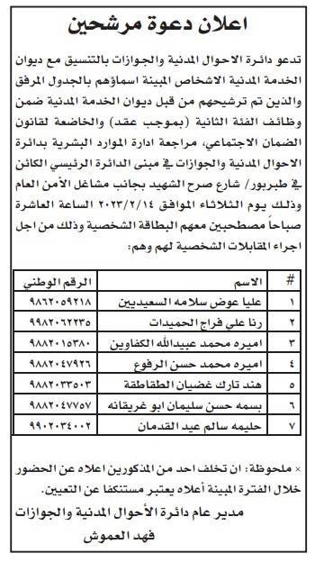 وأعلنت مؤسسات حكومية أخرى، عن أسماء مرشحين لإجراء المقابلات الشخصية لهم، وذلك بالتنسق مع ديوان الخدمة المدنية.