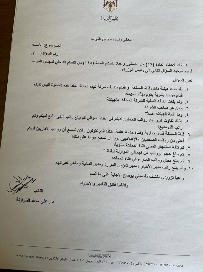 *الطراونة يسأل عن حجم الرواتب من اجمالي موازنة قناة المملكة
