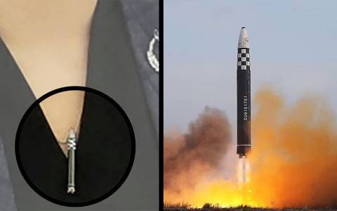 ظهرت زوجة الزعيم الكوري الشمالي كيم جونغ أون، خلال العرض العسكري، بمناسبة الذكرى الـ75 لتأسيس الجيش، وهي ترتدي قلادة على شكل أكبر صاروخ باليستي عابر للقارات في البلاد.