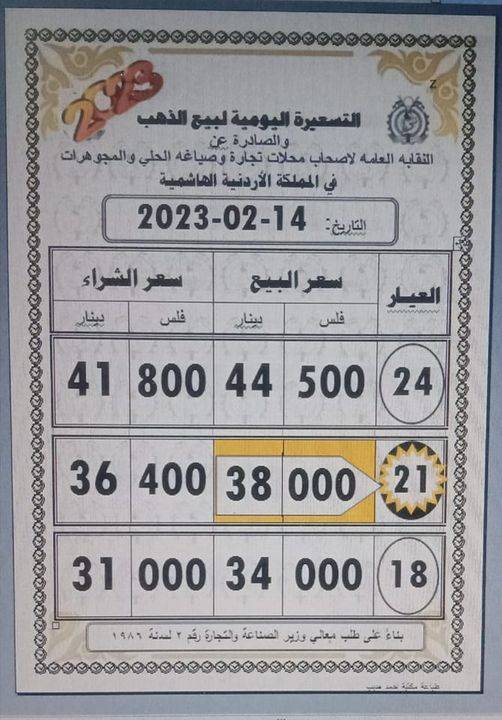 وبلغ سعر بيع غرام الذهب عيار 21 الأكثر رغبة من الأردنيين بالسوق المحلية عند 38,00 دينارا لغايات شراء المواطنين من محلات الصاغة.