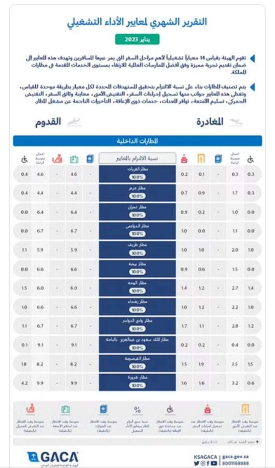 أصدرت الهيئة العامة للطيران المدني اليوم تقريرها الشهري عن أداء مطارات المملكة العربية السعودية الدولية والداخلية، لشهر يناير 2023 وفقًا لأربعة عشر معياراً أساسيًا لقياس الأداء، وذلك تطبيقاً للتوجُّهات الاستراتيجية التي تستهدف تجويد الخدمات المُقدَّمة للمسافرين، ورفع مستواها، وتحسين تجربة المسافر في مطارات المملكة.
