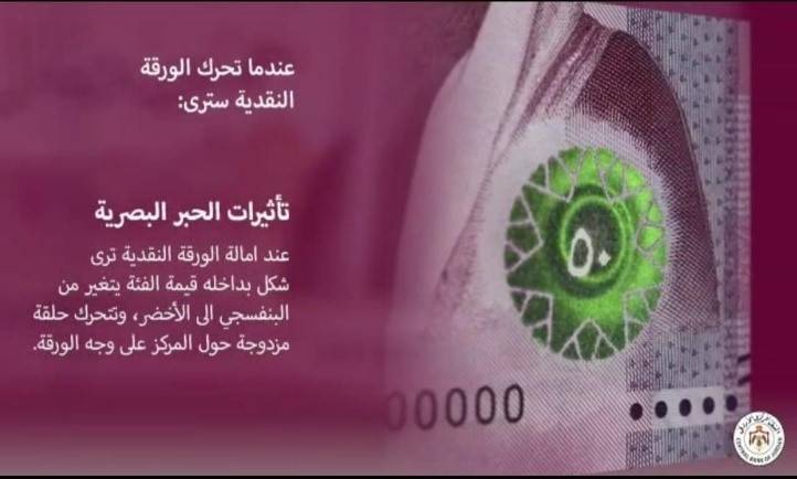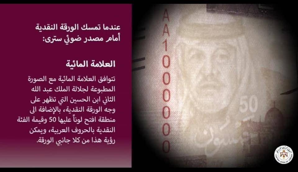 جدد البنك المركزي الأردني التأكيد على العلامات الأمنية التي تميز هذه الأوراق المالية فئة 50 ديناراً.