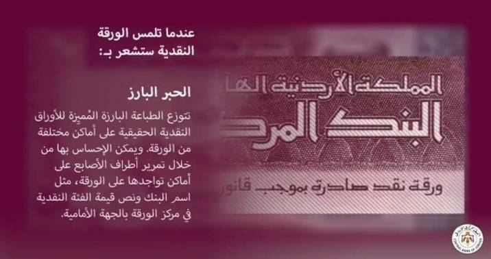 لذلك اقتضى الأمر من البنك المركزي الاردني التنويه وضرورة التأكيد على  كافة المواطنين والمتعاملين بضرورة الإنتباه والتأكد من وجود العلامات الأمنية الموضحة أعلاه، والتي سبق وأن قام البنك المركزي بنشرها وتوضيحها عبر وسائل الإعلام المحلية الرسمية وشبكات التواصل الاجتماعي ونشرها كذلك على الموقع الرسمي للبنك المركزي الأردني..