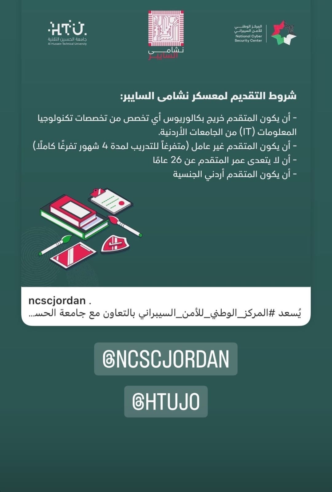 نشر سمو الأمير الحسين بن عبد الله الثاني، ولي العهد، عبر حسابه على انستغرام، شروط التقديم لمعسكر نشامى السايبر الذي يقام بالتعاون ما بين جامعة الحسين التقنية والمركز الوطني للأمن السيبراني.