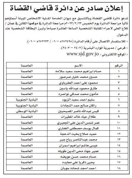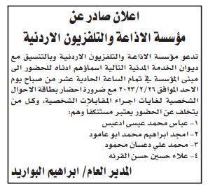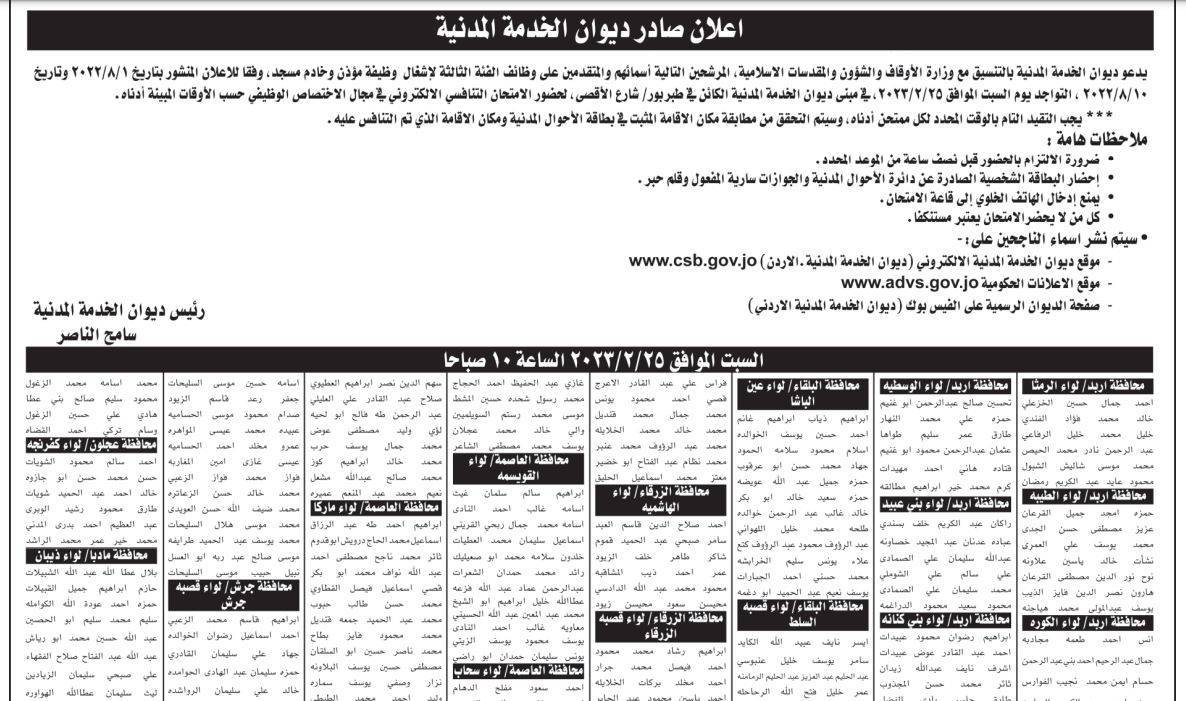 دعت عدد من الوزارات والمؤسسات الرسمية بالتنسيق مع ديوان الخدمة المدنية، اليوم الثلاثاء، عدداً من المرشحين لحضور الامتحان التنافسي واجراء المقابلات الشخصية.