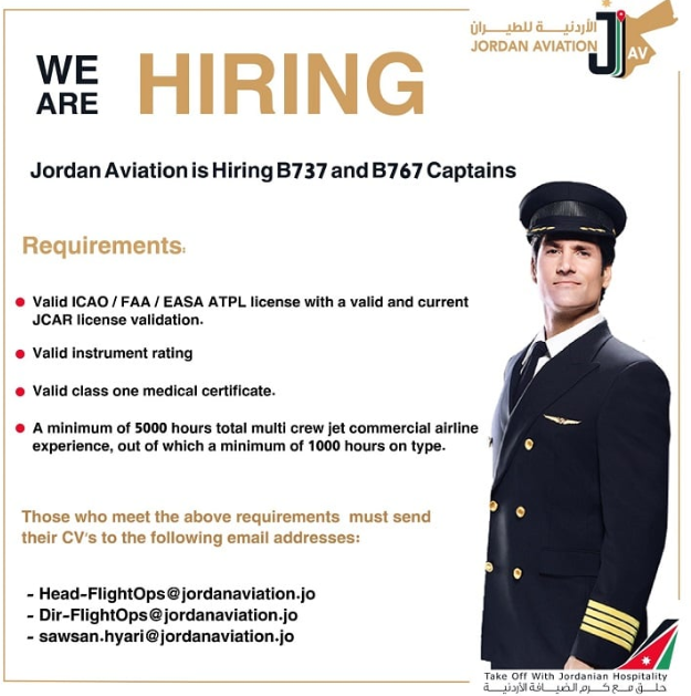 أعلنت الشركة الأردنية للطيران عن توفر شواغر لقائد طائرة لأنواع الطائرات التالية :Boeing 767 + Boeing 767.