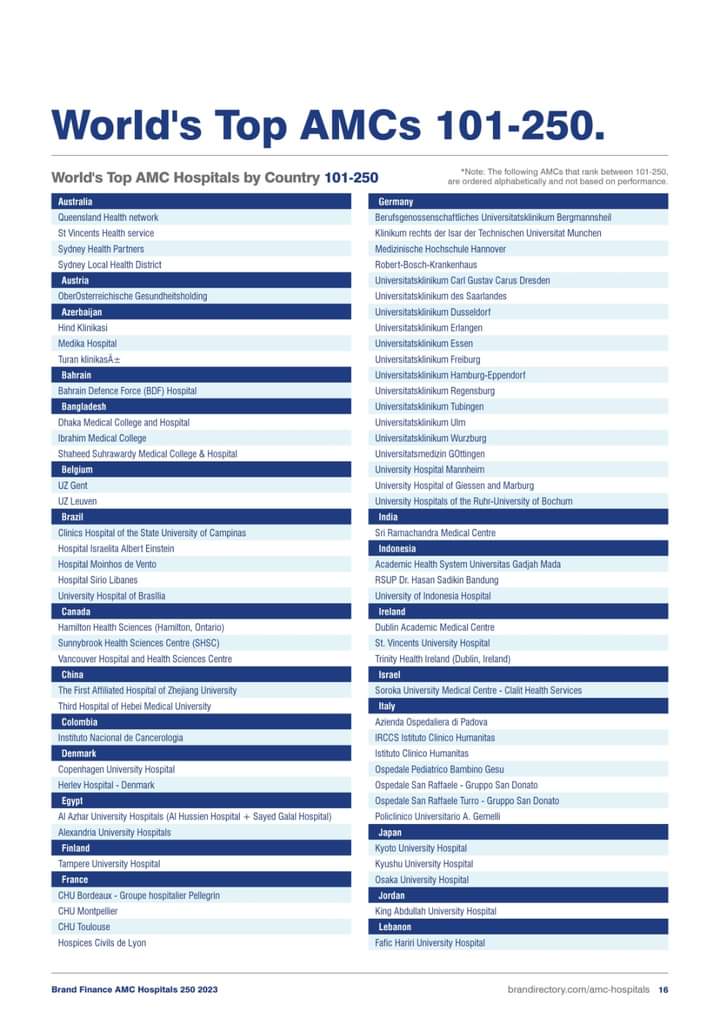 في تقريرها السنوي لعام 2023 الذي نشرته مؤسسة ( براند فاينانس ) العالمية  وهي مؤسسة إستشارات عالمية مقرها لندن ، والذي شمل أكثر من 2500 مركزا متخصصا في الرعاية الصحية من جميع أنحاء العالم حل مستشفى الملك المؤسس عبدالله الجامعي في المركز ما بين ( 101-250 ) .