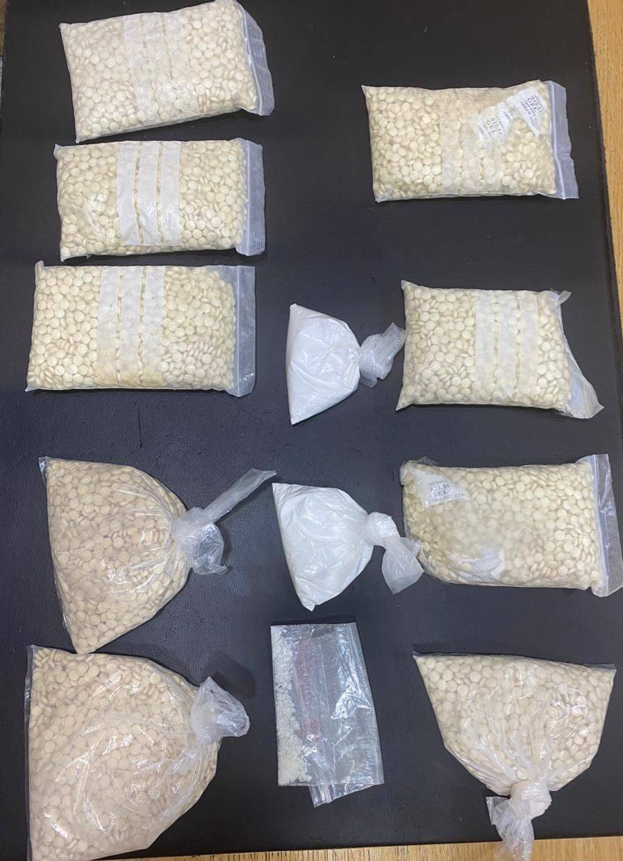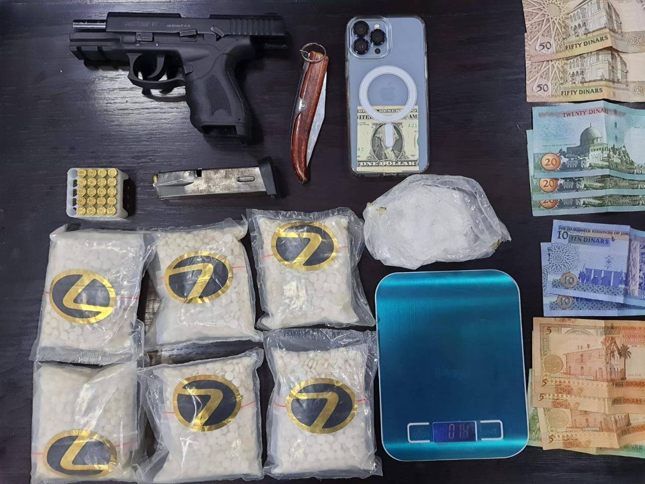وفي محافظة العقبة وبعد جمع المعلومات ومتابعة احد تجار المخدرات ممن يقومون بتزويد المروجين بتلك المواد ، والتأكد من حيازته لكميات كبيرة من المخدرات جرت مداهمة منزله والقاء القبض عليه وضبط بحوزته 700 غم من مادة الكوكايين و 10 آلاف حبة مخدرة و 1 كغم من مادة الحشيش وسلاح ناري .