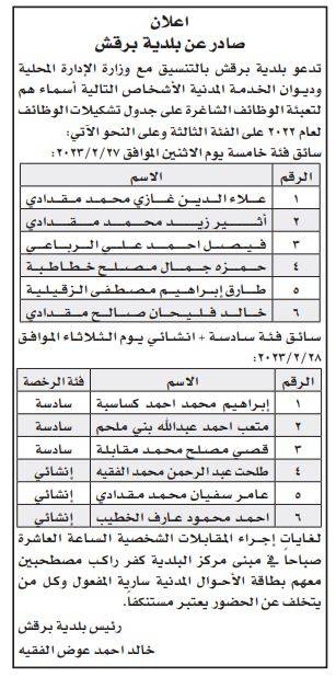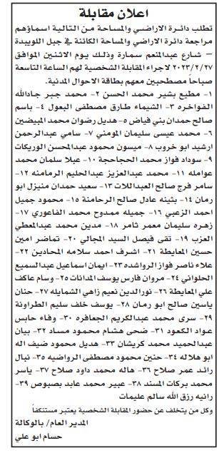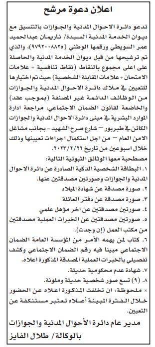 دعت عدد من المؤسسات الحكومية اليوم الأربعاء، بالتنسيق مع ديوان الخدمة المدنية، عدداً من المرشحين مراجعتها لاستكمال إجراءات التعيين.