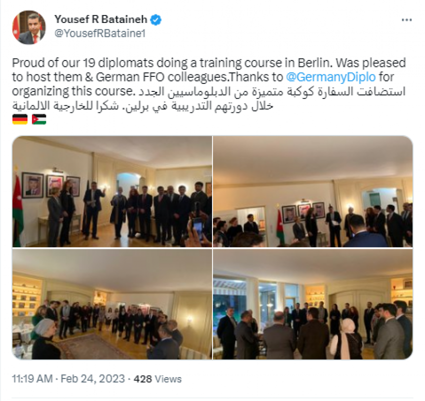 عبر السفير الاردني في المانيا، يوسف البطانية، في تغريدة له عبر تويتر، عن فخره بـ 19 دبلوماسيًا اردنيا جديدا والذين يقومون بدورة تدريبية في برلين.