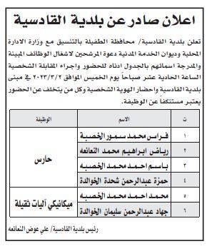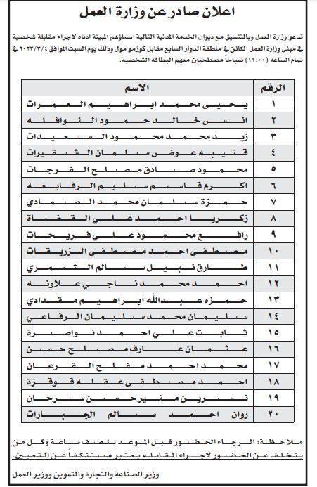 دعت عدد من الوزرات والمؤسسات الرسمية بالتنسيق مع ديوان الخدمة المدنية اليوم الإثنين، عدداً من المرشحين لإجراء المقابلات الشخصية.