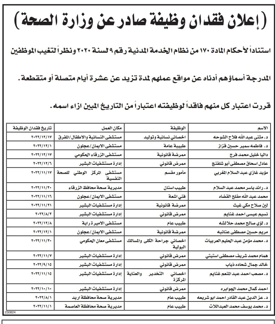 فاقدون لوظائفهم في وزارة الصحة (أسماء)