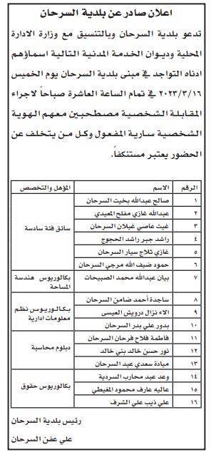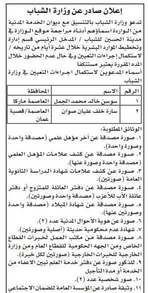 دعت عدد من المؤسسات الحكومية اليوم الخميس، بالتنسيق مع ديوان الخدمة المدنية، عدداً من المرشحين مراجعتها لاستكمال إجراءات التعيين.