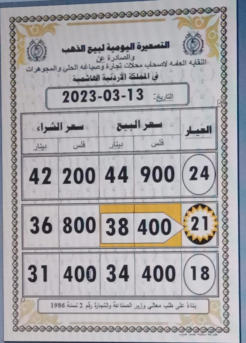 وبلغ سعر الذهب عيار 21 الأكثر طلبا من قبل الأردنيين 38.40 دينارا لجهة الشراء من المحلات و 36.80 دينارا لجهة البيع.
