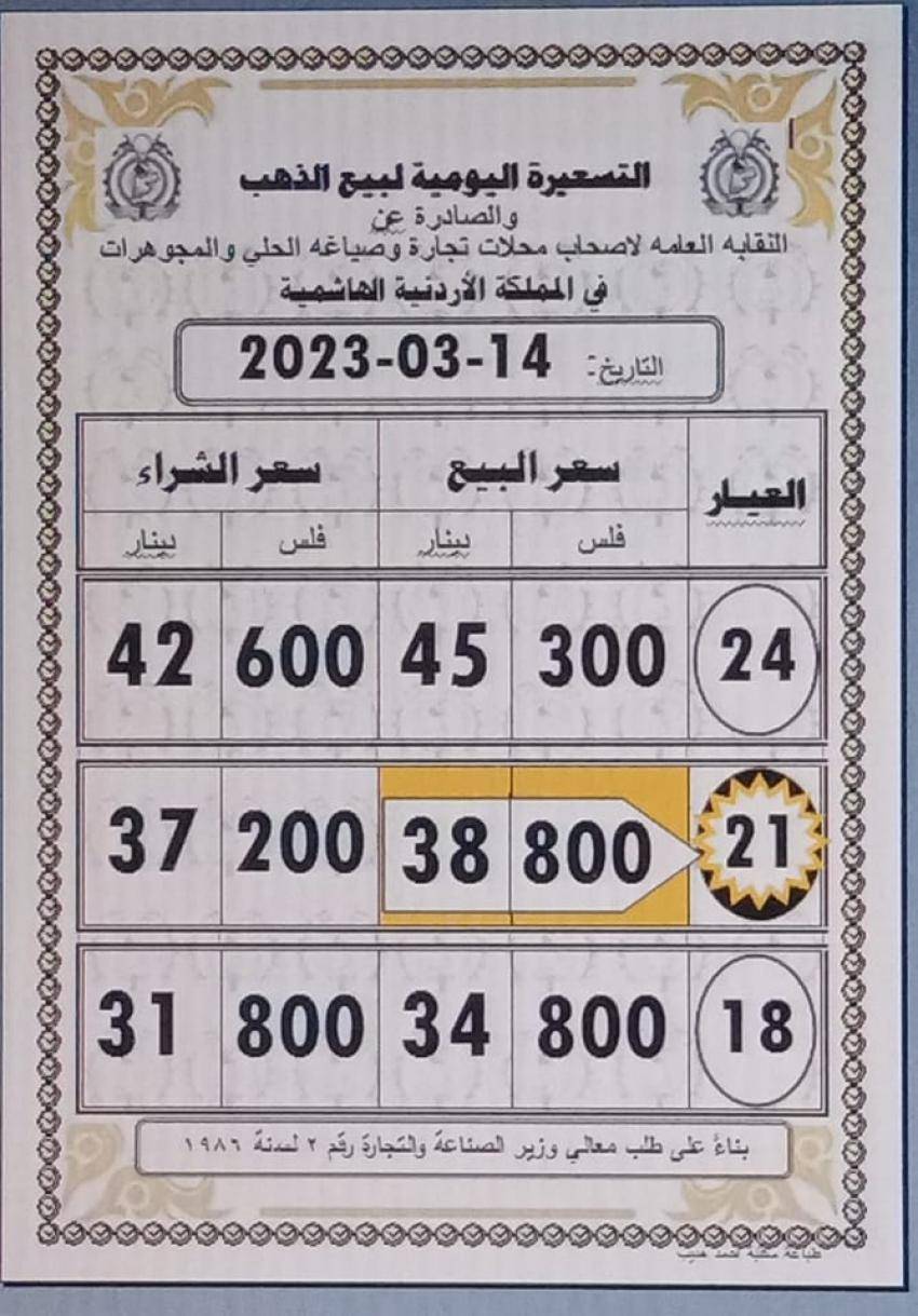 وبلغ سعر بيع غرام الذهب عيار 21 الأكثر رغبة من الأردنيين بالسوق المحلية عند 38.80 دينارا لغايات شراء المواطنين، مقابل 37.20 دينارا لجهة الشراء من محلات الصاغة.