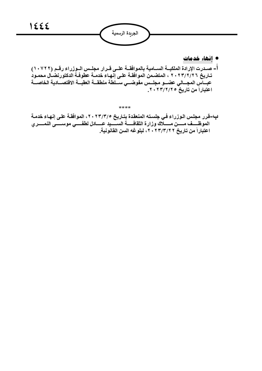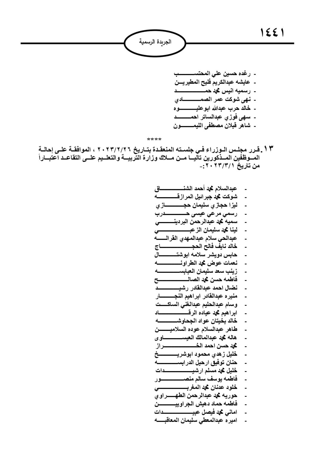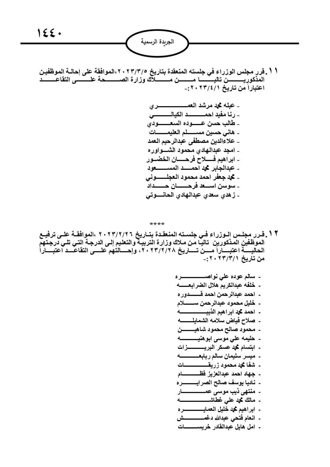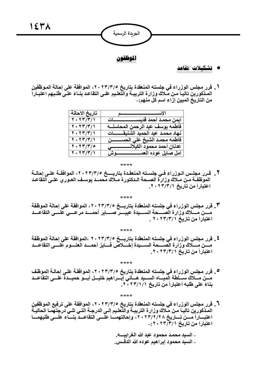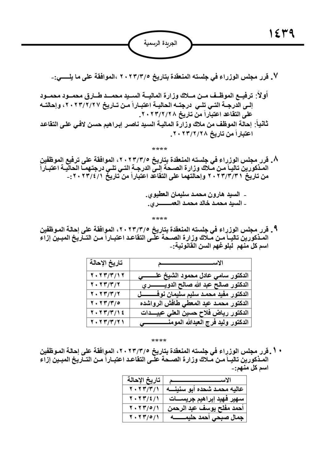 قرر مجلس الوزراء إحالة عدد من موظفي القطاع العام إلى التقاعد، وتعيين وترفيع آخرين.