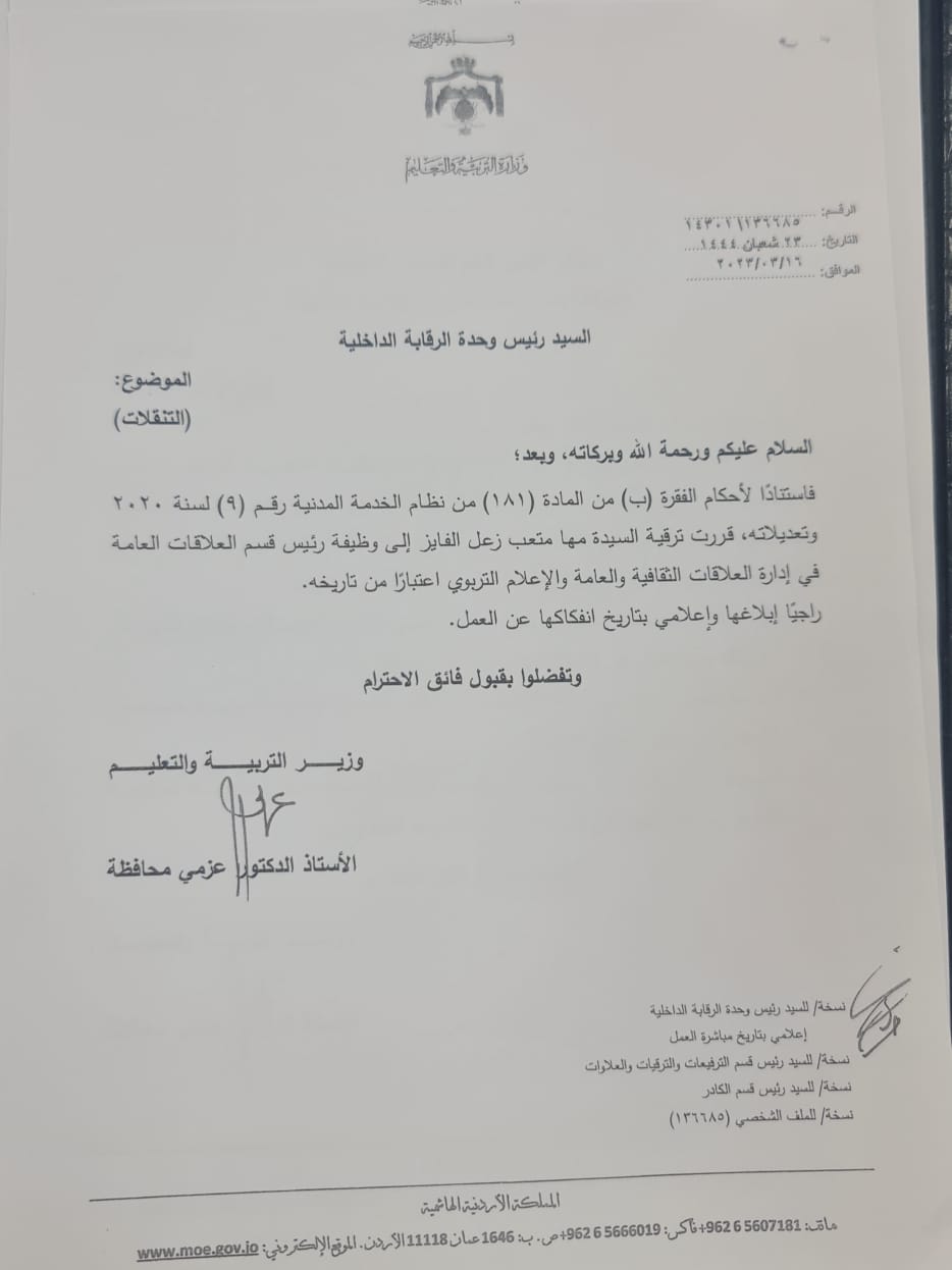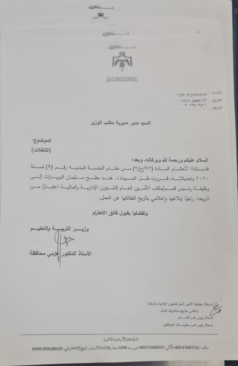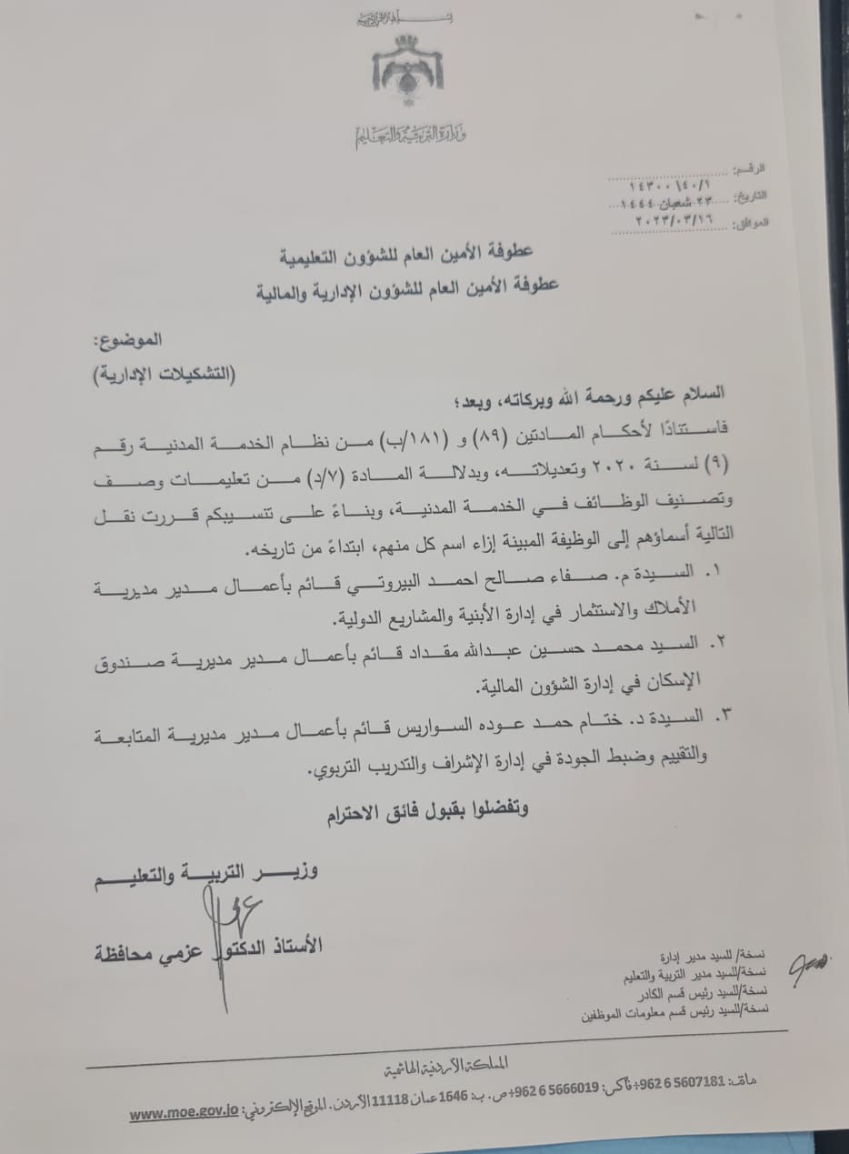 قرر وزير التربية والتعليم والتعليم العالي الدكتور عزمي محافظة إجراء تشكيلات وتنقلات شملت عددا من الموظفين .