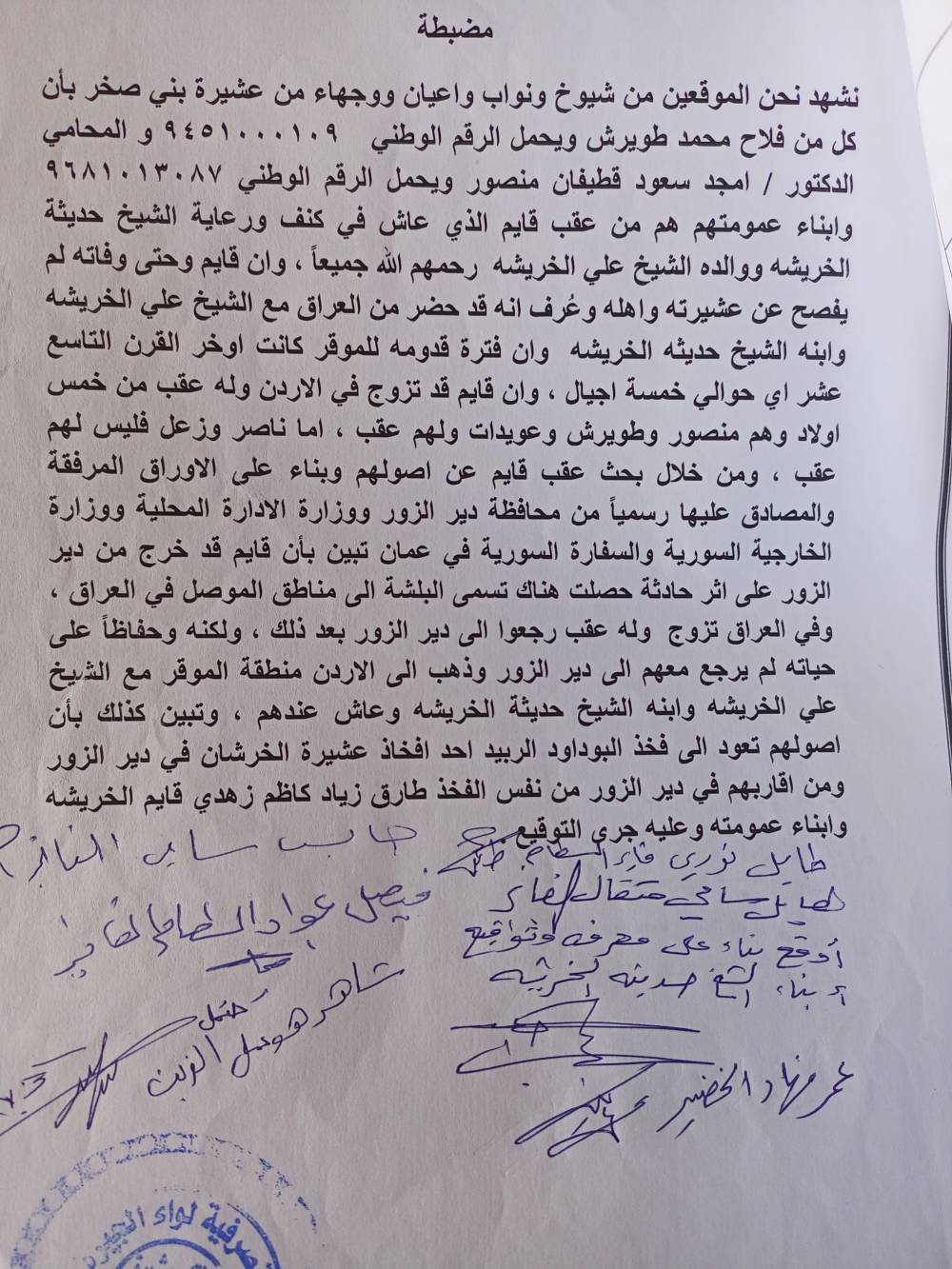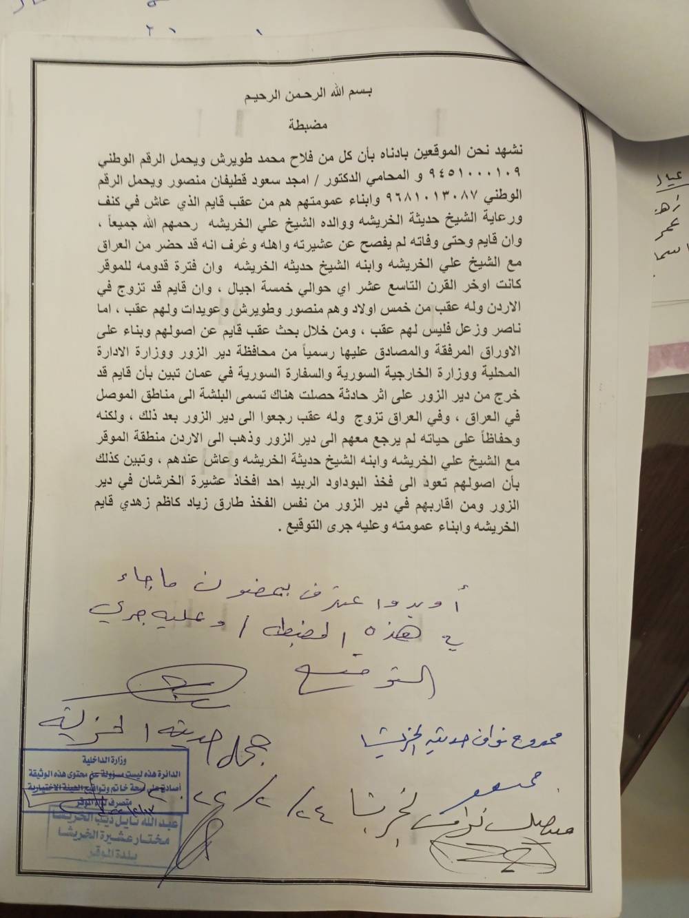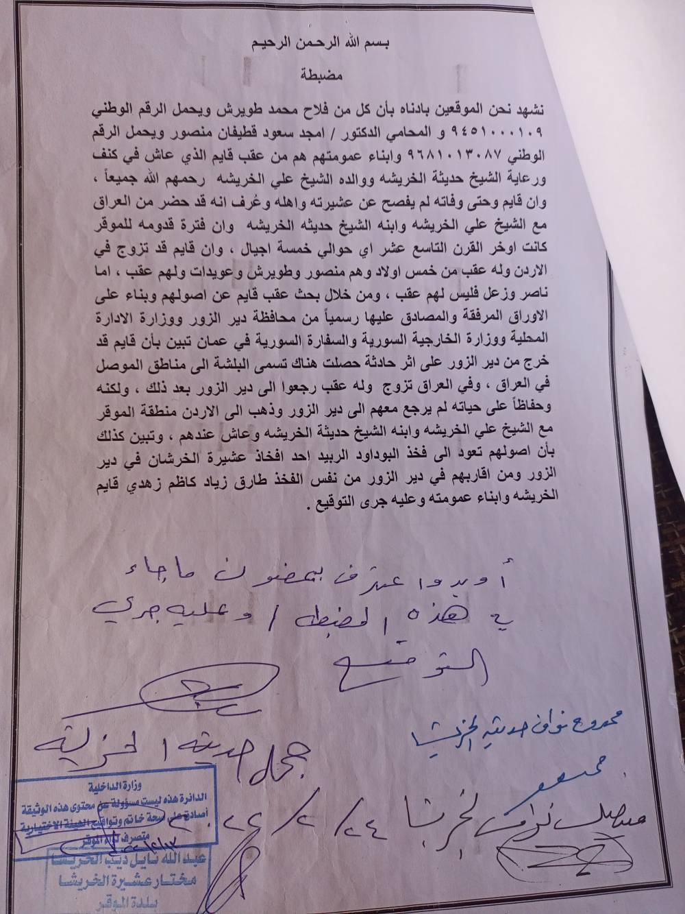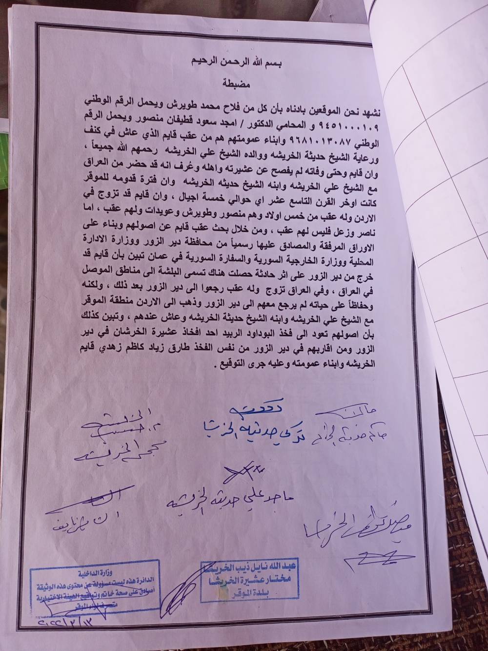 واكد على ان  أبناء  قايم الخريشا عشيرة اصيلة من الخرشان ونحن من حزام ظهر هذه العشيرة حيث ان رابط الدم الذي بيينا ثابت اصيل  ومن هنا نعلن صحة  النسب .