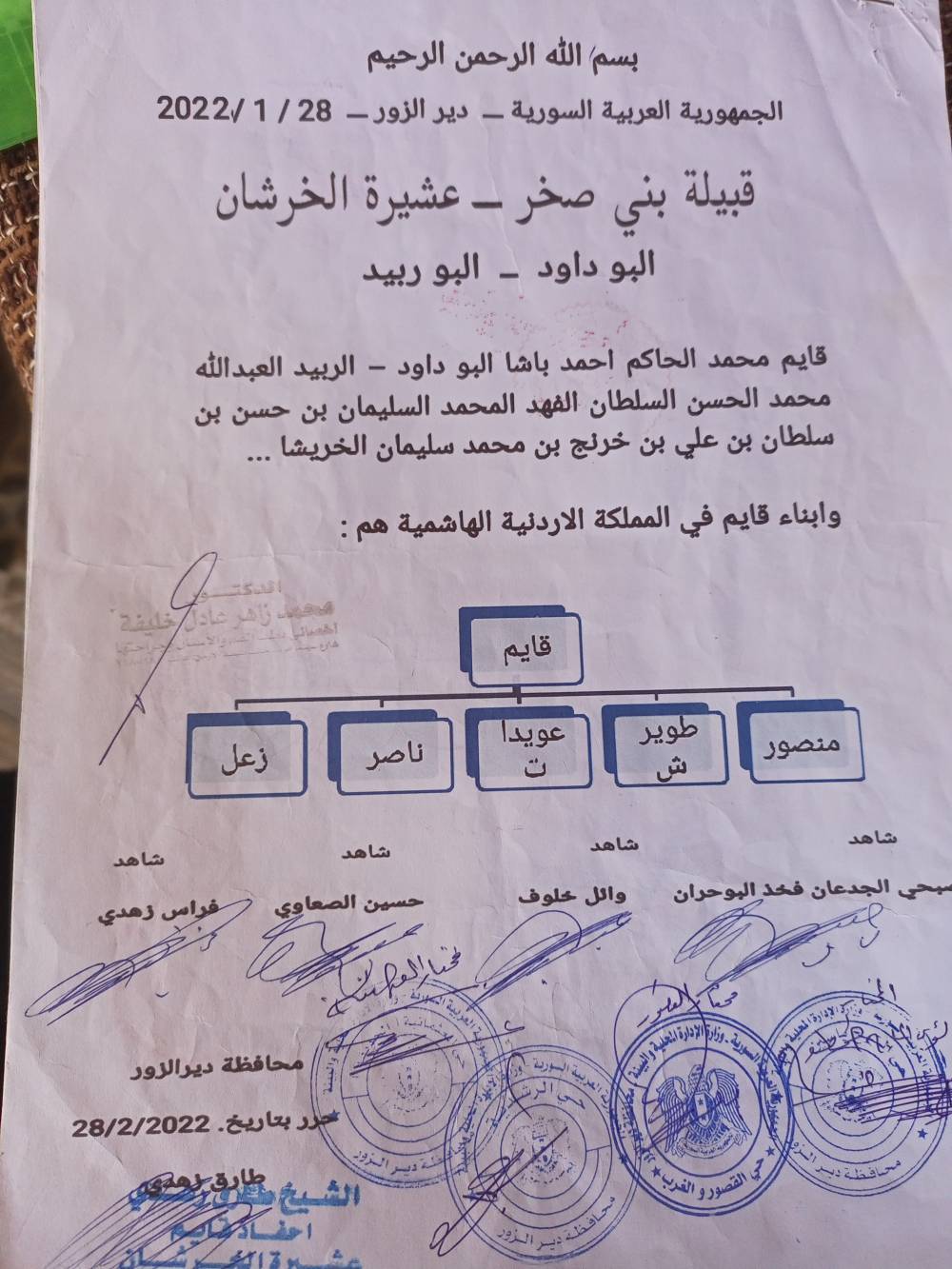 عشيرة بني صخر عامة و الخرشان خاصة أنا  شيخ  عشيرة الخرشان فخذ البوداوود في دير الزور بالانابة عني وعن جميع الافخاد والعوائل وباسم أحفاد قايم الخريشا المتواجدين في محافظة دير الزور الذين نجل لهم كل الاحترام والتقدير اعلن اشهار نسبنا من أرض الفرات مع أبناء عمومتنا أحفاد قايم في المملكة الاردنية الهاشمية .