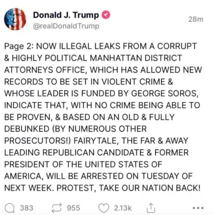 وزعم ترمب في حسابه على موقع "تروث سوشيال" أن محكمة مانهاتن ستعتقله يوم الثلاثاء، بسبب مزاعم لا صحة لها ومن دون دليل.