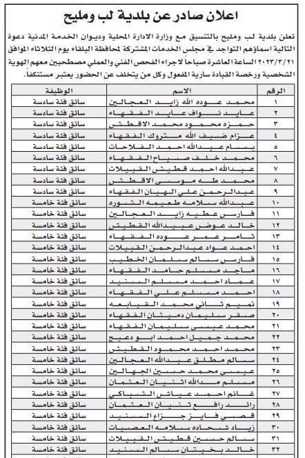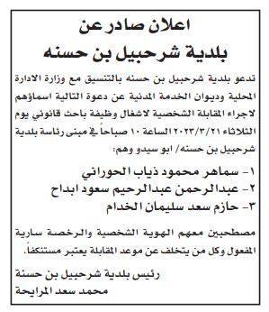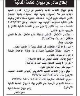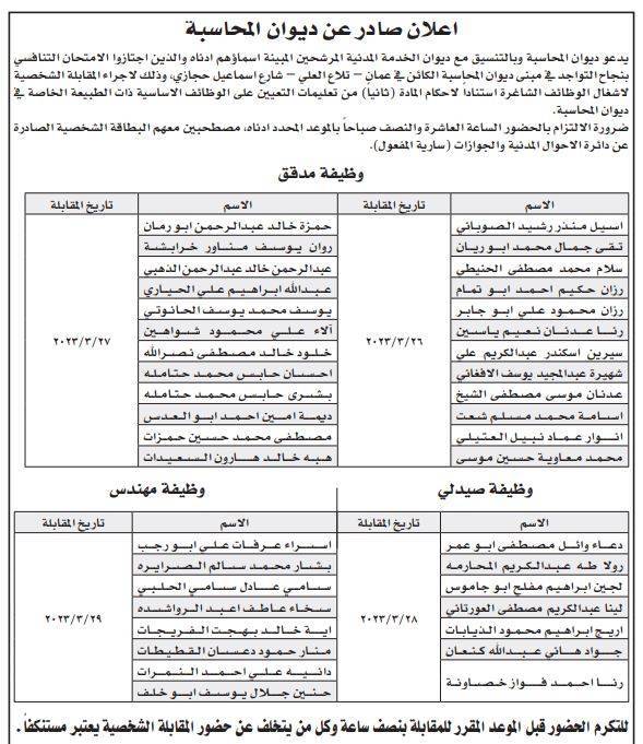 أعلنت عدد من المؤسسات والبلديات اليوم الأحد، بالتنسيق مع ديوان الخدمة المدنية، عن حاجتها لتعبيئة وظائف شاغرة، كما دعت عدد من المرشحين لإجراء المقابلات الشخصية .