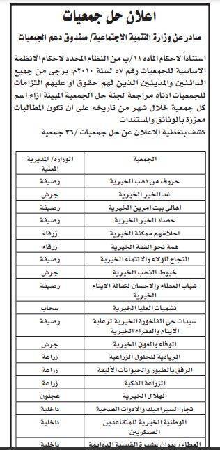 ودعت وزارة التنمية، الدائنين والمدينين الذين لهم حقوق أو عليهم التزامات للجمعيات أناه مراجعة لجنة حلّ الجمعية المبينة إزاء كل جمعية خلال شهر من تاريخه.
