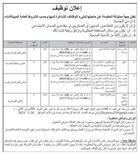 أعلنت عدد من المؤسسات الحكومية، اليوم الثلاثاء، عدد من الوظائف الشاغرة لديها، بالتنسيق مع ديوان الخدمة المدنية.