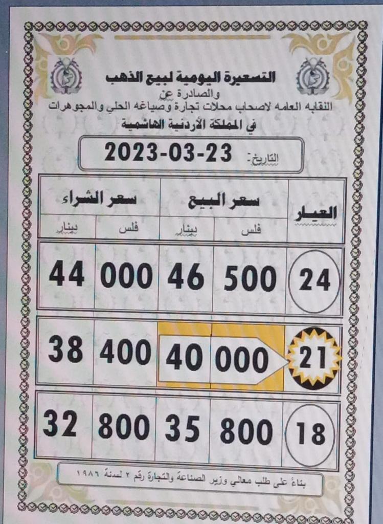 وبحسب التسعيرية اليومية، ارتفع سعر بيع غرام الذهب عيار 21 قيراط، الأكثر طلبا بين الأردنيين عند 40 دينارا، و38.4 دينار للشراء.