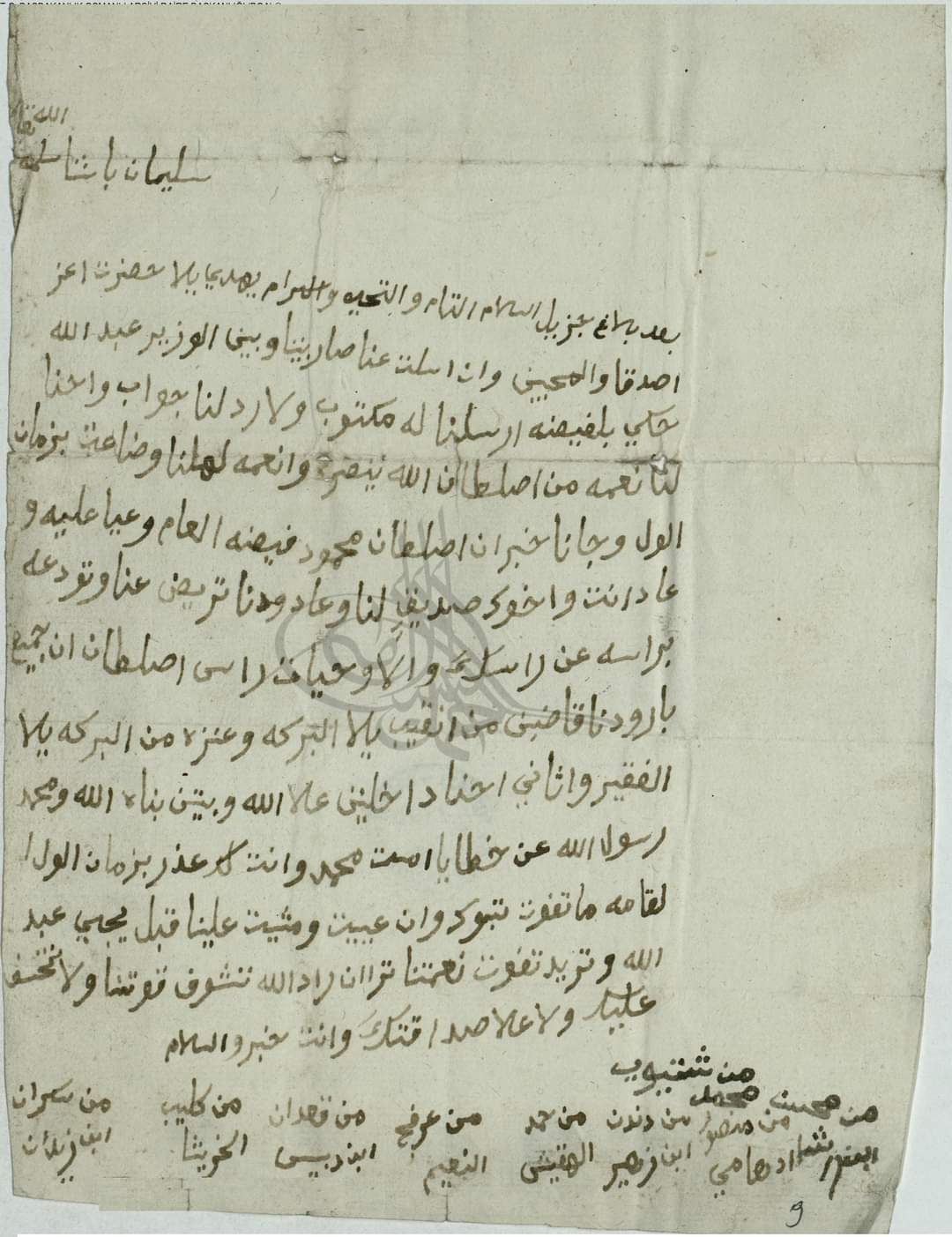 النص: [ بعد بلاغ جزيل السلام التام والتحية والإكرام، يُهدى إلى حضرة أعز أصدقاء والمحبين ، سليمان باشا سلمه الله تعالى ،  وإن " اسلت" (سألت) عنّا صار بينا وبين الوزير عبد الله، حكي "بلفيضة"(2) ، أرسلنا له مكتوب ولا رد لنا جواب ، واحنا لنا نعمة (3) من السلطان الله ينصره، والنعمة " لهلنا" (لأهلنا) وضاعت بزمان " الول" (الأول)، وجانا خبر ان السلطان محمود "فيضة" ( فوّضه) العام (هذه السنة)   و"عيا" ( عوّل) عليه، وعاد إنت  وأخوك صديق لنا ، وعاد ودنا، "تريّض"(4) عنا "وتودعه" براسه عن راسك (5) ، وإلّا وحياة راس السلطان ان جميع  بارودنا  "قاضبن" (6) من "انقيب" ( النقب) إلى البركة (7)، وعنزة من البركة إلى الفقير ( 8 ) ، والثاني احنا داخلين على الله و"بيتن بناه"( والبيت الذي بناه)، الله ومحمد رسول الله عن خطايا امة محمد ، وانت لك عذر ، بزمان " الول" (الأول) القامة  ما تفوت  تبوك، وان "عييت"(9) ومشيت علينا قبل يجي عبد الله، وتريد تفوت نعمتنا ، ترا إن راد الله تشوف قوتنا، ولا تخفى عليك، ولا على صداقتك وانت (بخير) والسلام].