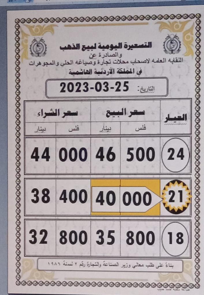 وبحسب التسعيرية اليومية، استقر سعر بيع غرام الذهب عيار 21 قيراط، الأكثر طلبا بين الأردنيين عند 40 دينارا، و38.4 دينار للشراء.