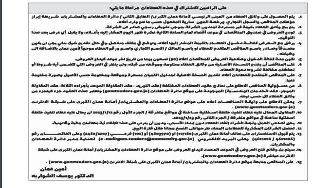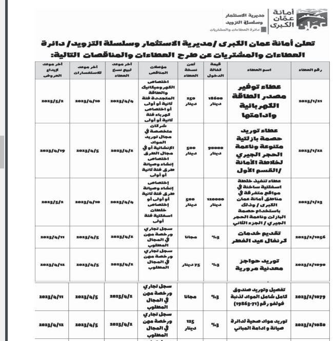 أعلنت أمانة عمان الكبرى اليوم الإثنين عن طرحها 18 عطاء ومناقصة مختلفة.