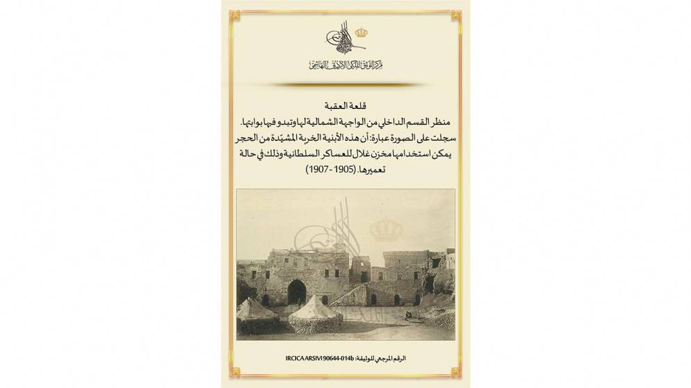 عرض مركز التوثيق الملكي الأردني الهاشمي، الاثنين، وثيقة عثمانية من محفوظات الأرشيف التركي تتضمن منظر القسم الداخلي من الواجهة الشمالية لقلعة العقبة وتبدو فيها بوابتها.