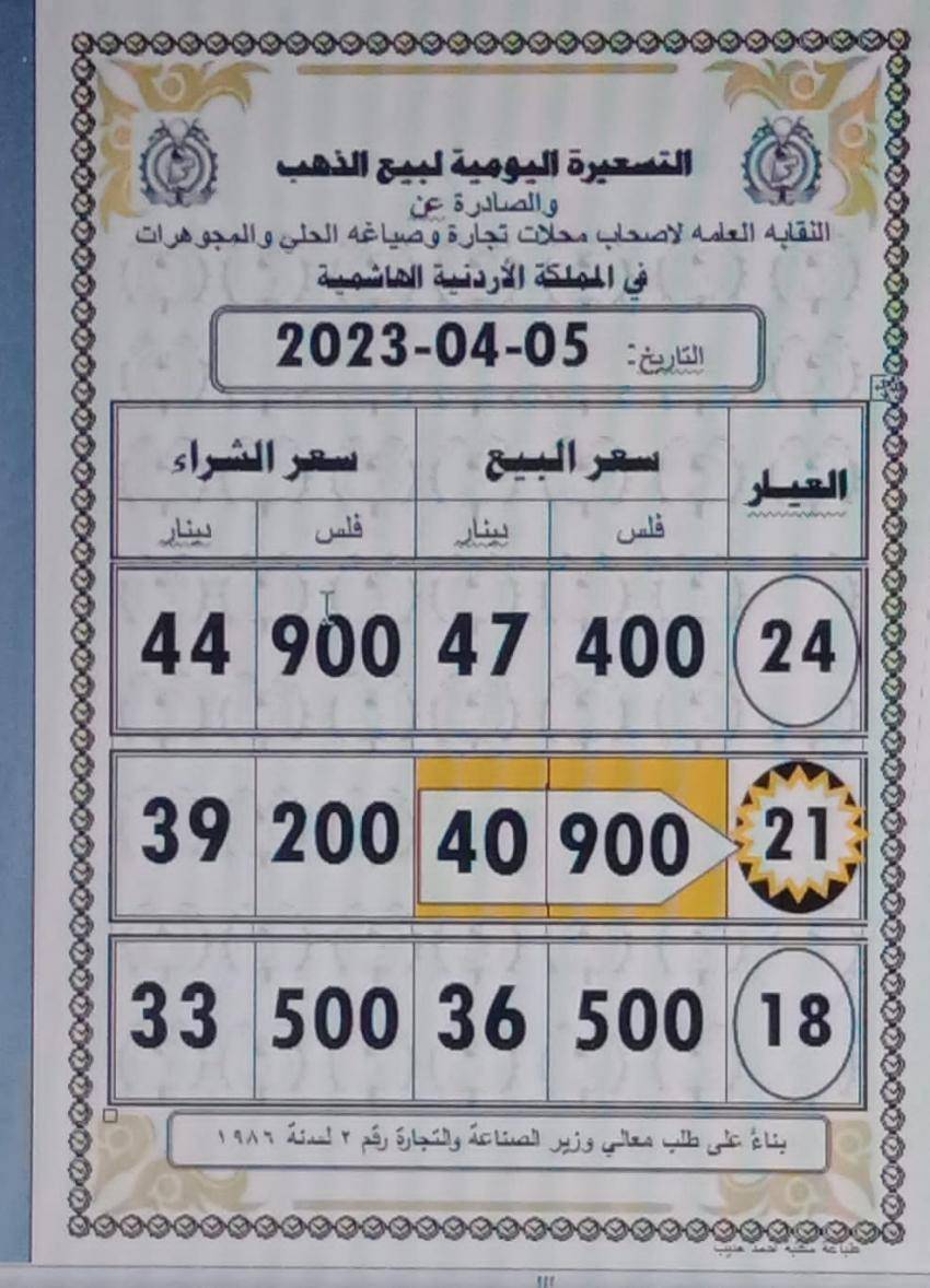 كما بلغ سعر بيع الغرام الواحد من الذهب عيار (24) 47.40 دينارا مقابل 36.50 للذهب عيار 18.
