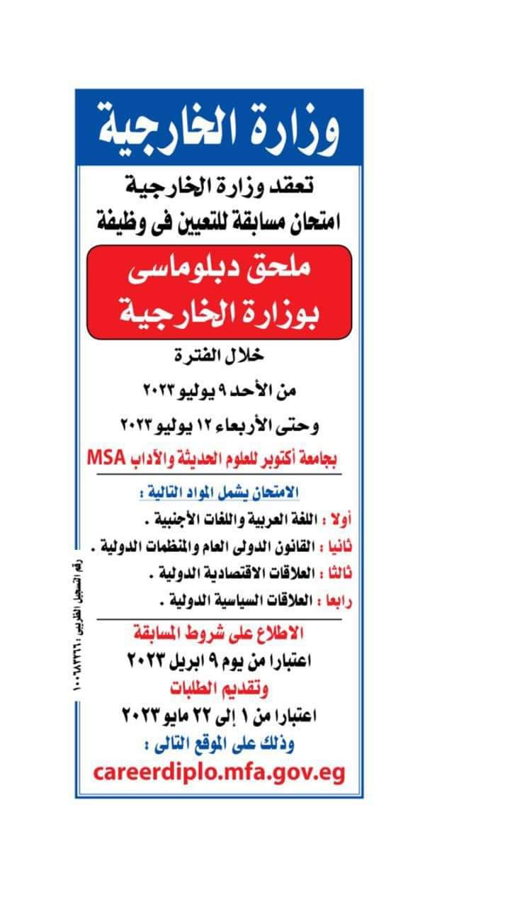 وأفادت الخارجية في بيان بأنه يُعقد امتحان مسابقة للتعيين في وظيفة ملحق دبلوماسي بوزارة الخارجية خلال الفترة من الأحد 9 يوليو 2023 وحتى الأربعاء 12 يوليو 2023 بجامعة أكتوبر للعلوم الحديثة والآداب MSA
