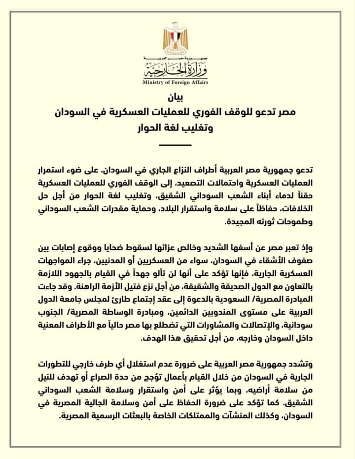 وتشدد جمهورية مصر العربية على ضرورة عدم استغلال أي طرف خارجي للتطورات الجارية في السودان من خلال القيام بأعمال تؤجج من حدة الصراع أو تهدف للنيل من سلامة أراضيه، وبما يؤثر على أمن واستقرار وسلامة الشعب السوداني الشقيق. كما تؤكد على ضرورة الحفاظ على أمن وسلامة الجالية المصرية في السودان، وكذلك المنشآت والممتلكات الخاصة بالبعثات الرسمية المصرية.