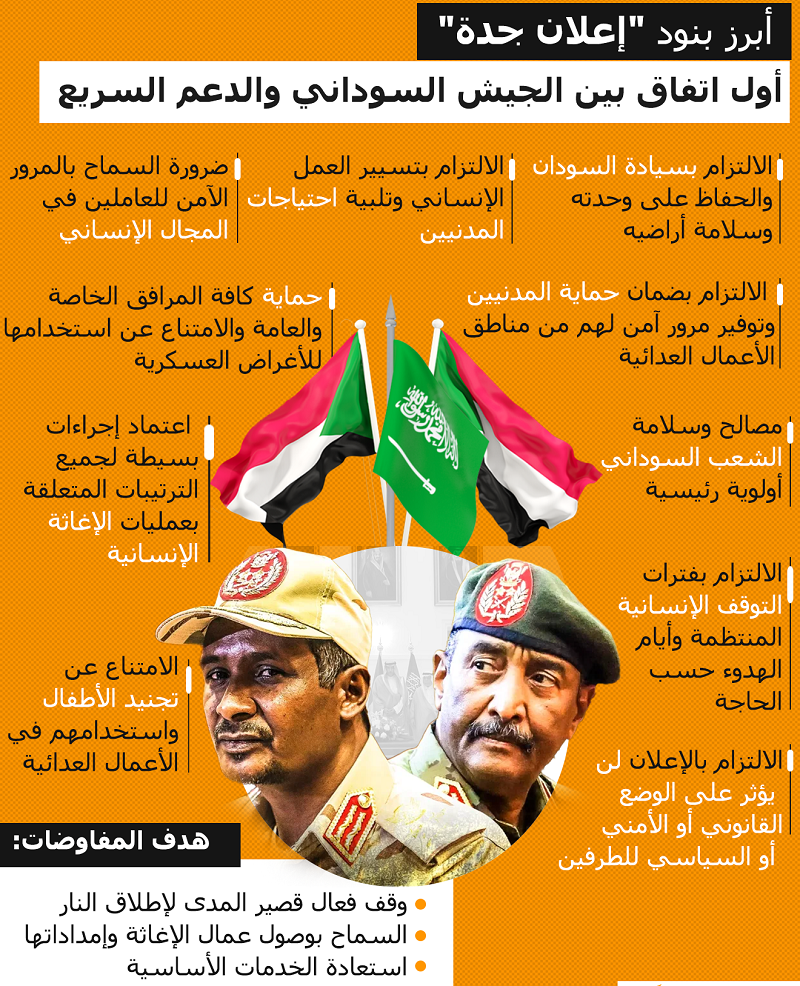 ويعتبر هذا الاتفاق هو الأول بين الجيش وقوات الدعم السريع منذ بداية النزاع في 15 أبريل/ نيسان الماضي، حيث أكد وزير الخارجية السعودي الأمير فيصل بن فرحان، أن التوقيع على الاتفاق المبدئي الأولي بين الجيش السوداني وقوات الدعم السريع في جدة يشكل خطوة أولى، ستتبعها خطوات أخرى.