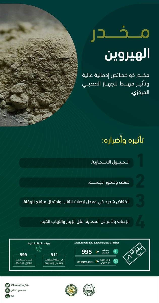أكدت المديرية العامة للمخدرات في المملكة العربية السعودية أن متعاطي مخدر الهيروين ذو ميول انتحارية، ومعرّض للإصابة بالأمراض المعدية، مثل الإيدز والتهاب الكبد.