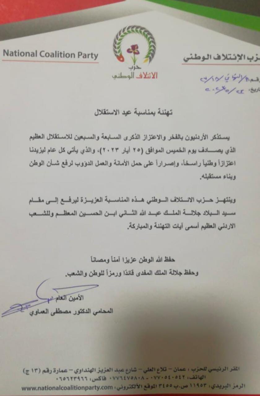 وقدم العماوي التهنئة : ينتهـز حـزب الائتلاف الـوطني هـذه المناسبة العزيـزة ليرفـع إلـى مـقـام سـيد الـبلاد جلالة الملك عبـد الله الثـانـي ابـن الحسين المعظـم وللشـعب الاردني العظيم أسمى آيات التهنئة والمباركة.