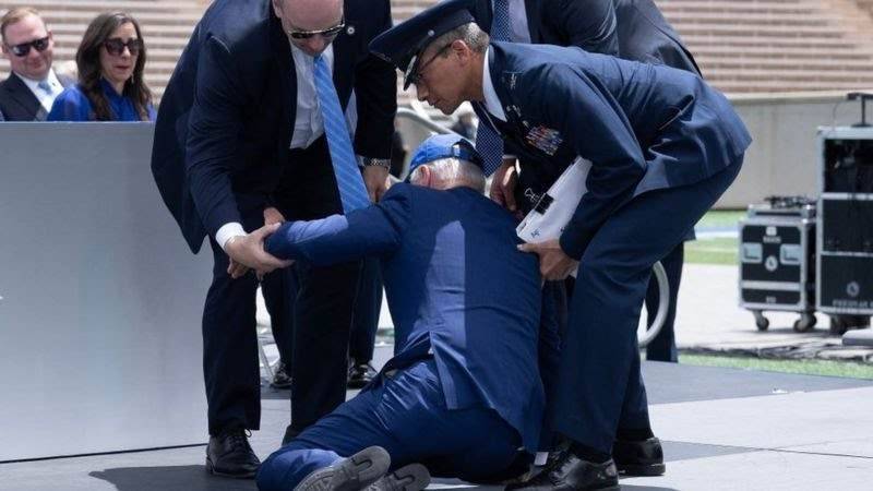 وتعثرت خطى الرئيس الأميركي البالغ من العمر 80 عاما ليتلقى سقوطه على يديه ثم نهض على ركبة واحدة بمساعدة ثلاثة أشخاص. ثم عاد إلى مقعده دون مساعدة.