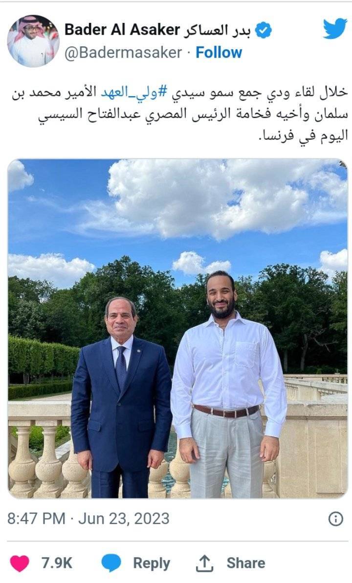 فيما نشر مدير المكتب الخاص لولي العهد السعودي بدر العساكر، صورة تجمع الأمير محمد بن سلمان، والرئيس المصري عبدالفتاح السيسي، معلقًا عليها بقوله: "خلال لقاء ودي جمع سمو سيدي ولي العهد الأمير محمد بن سلمان وأخيه فخامة الرئيس المصري عبدالفتاح السيسي اليوم في فرنسا".