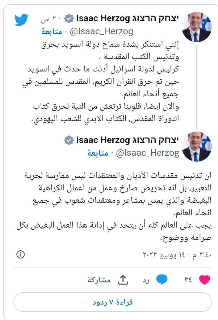 كذلك، استنكر الرئيس الإسرائيلي، إسحاق هرتسوغ، "بشدّة” سماح السويد بحرق نسخة من التوراة، مشيرا إلى أن تدنيس الأديان والمعتقدات ليس ممارسة لحرية التعبير.