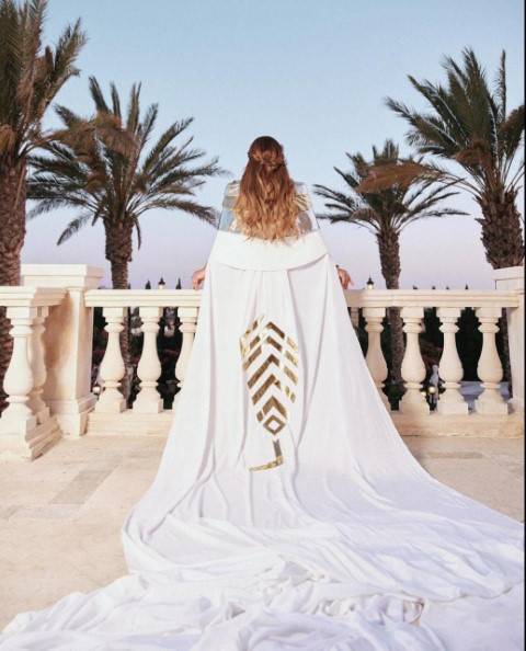 تميّز الرداء الأبيض بكتفين عريضتين تنسدلان مع الذيل واليدين بشكل واسع، مع تضمّنه اللونين الذهبي والفضي. واختص الرداء بزركشات الرسوم الهندسية على ظهره. ونسّقت نجوى كرم كرم الرداء مع جمبسوت أبيض، ببنطال واسع، وتصميم مع كتفين عاريتين في جزئه العلوي.