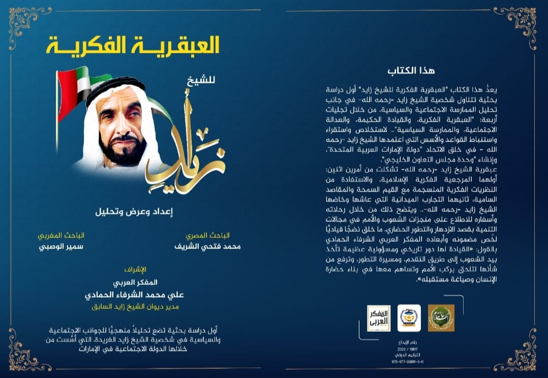 أصدر مركز العرب للأبحاث والدراسات، دراسة بحثية متخصصة بعنوان (العبقرية الفكرية للشيخ زايد)، والتي تعد أول دراسة بحثية تتناول شخصية الشيخ زايد -رحمه الله- في جانب تحليل الممارسة الاجتماعية والسياسية، من خلال تجليات أربعة: (العبقرية الفكرية، والقيادة الحكيمة، والعدالة الاجتماعية، والممارسة السياسة)، والتي شارك في إعدادها وتحليل مضمونها الباحث المصري محمد فتحي الشريف رئيس مركز العرب، والباحث المغربي د. سمير الوصبي رئيس وحدة الدراسات الاجتماعية بالمركز، وذلك تحت إشراف المفكر العربي الكبير علي محمد الشرفاء الحمادي مدير ديوان الشيخ زايد السابق، وتولت دار (المفكر العربي) للنشر، مهمة نشرها في كتاب يحمل اسم العبقرية الفكرية للشيخ زايد.